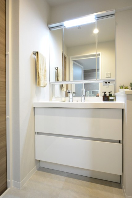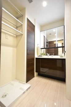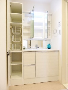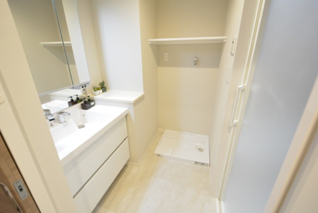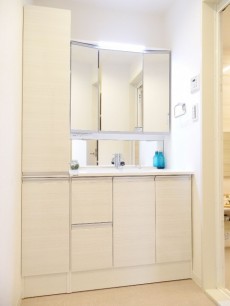 【洗面室:三面鏡付き洗面化粧台・洗濯機スペース・収納棚】