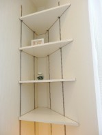 洗面室内には天井まであるオープンシェルフも設置されています。