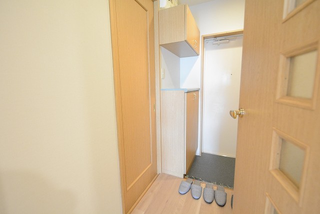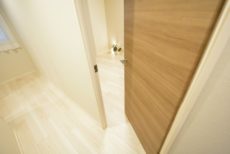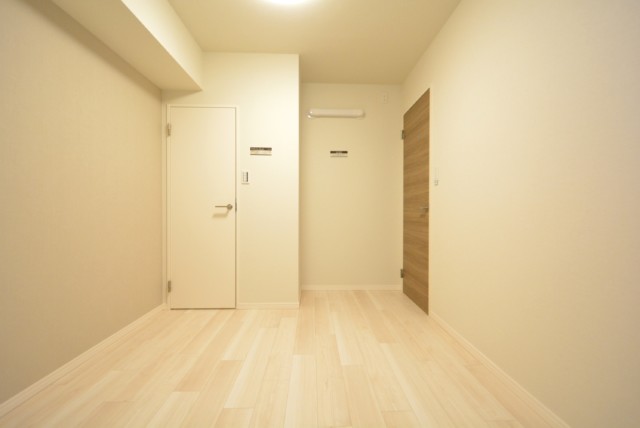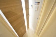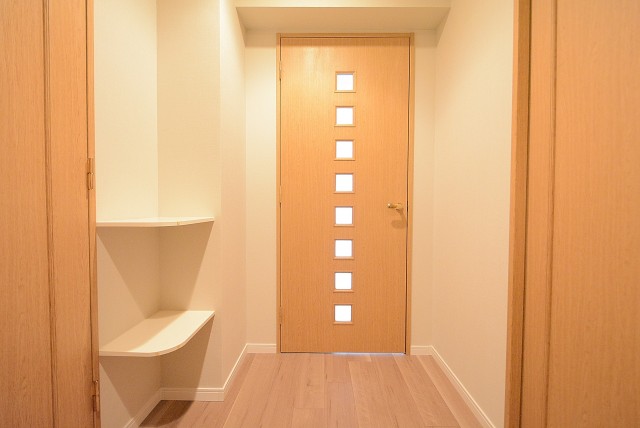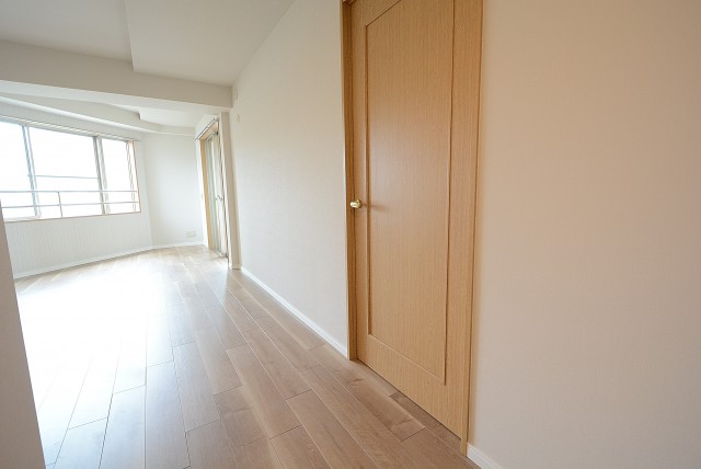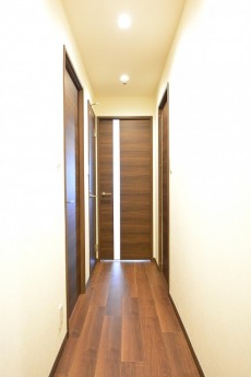 左側に洋室、右側にトイレと洗面室、正面にLDKの扉があります。