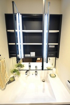 3面鏡の裏が一面収納になっている洗面化粧台。コスメやハブラシなどゴチャゴチャしがちな物もスッキリ片付けておけるようになっています。