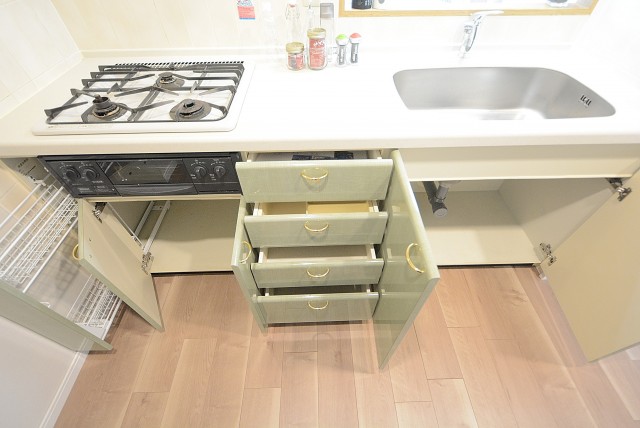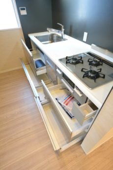 スライド式の収納はキッチングッズの出し入れもしやすく使い勝手もよさそうです。