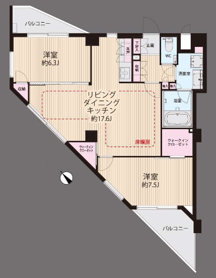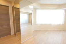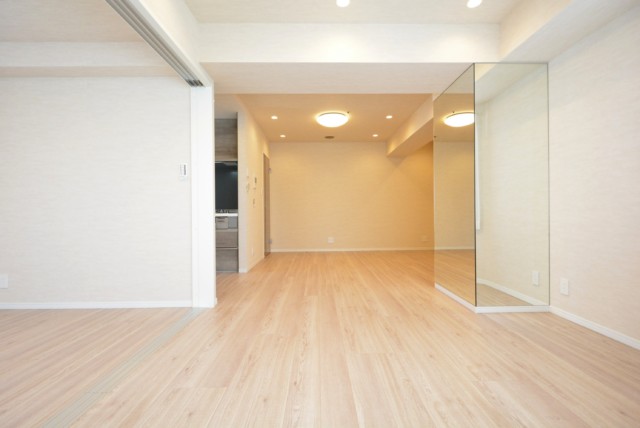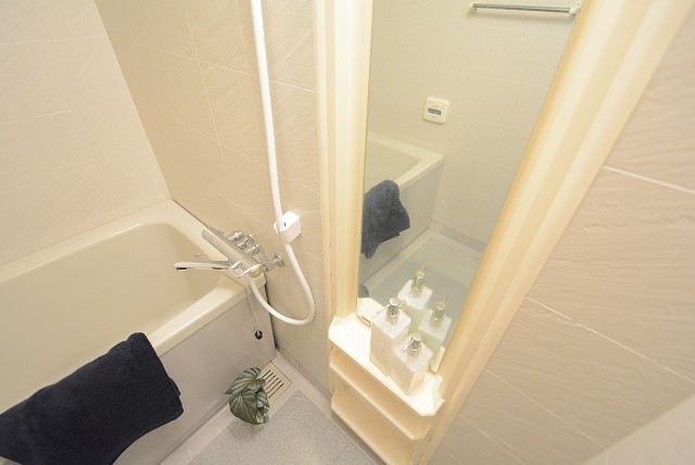 床には床暖房が設置されていて足元からポッカポカ。エアコンによる暖房が苦手な方でも安心ですよ。出っ張った柱には全面鏡が貼られていて、お部屋を広く見せるのに一役買っています。