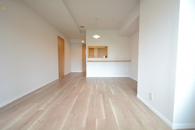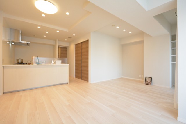 こちらは約17.6帖のリビング・ダイニング・キッチン。西向きの窓がある明るいお部屋です。キッチンは右側の奥まった所にあり、見えている部分をリビング・ダイニングに充てられると考えるとかなり余裕がありますね。スペース的に、レイアウト例にあったように窓際がダイニング、手前がリビングが良さそうです。