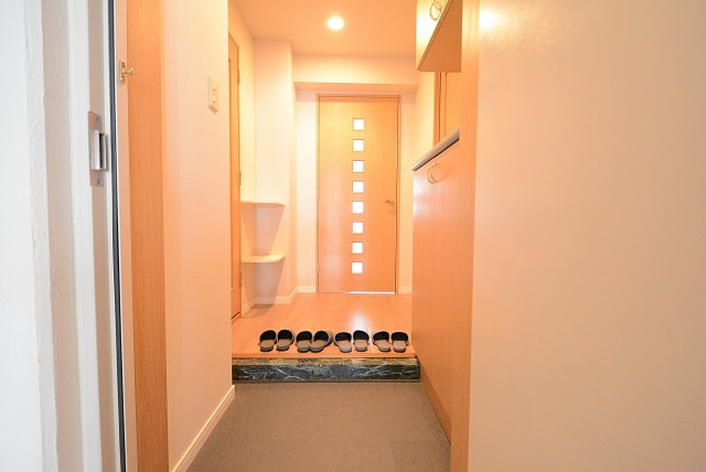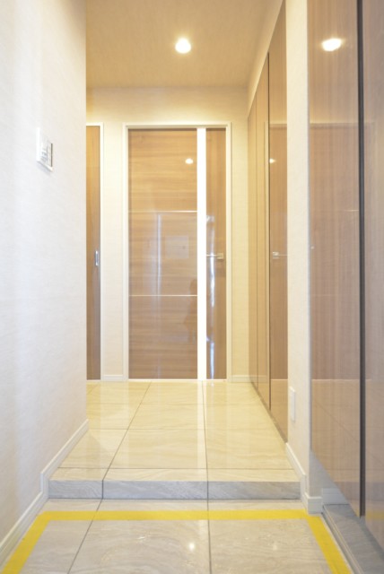 玄関からホールに掛けては大理石様のタイル貼り。建具の鏡面仕上げも併せて高級感がありますね。ホールは左方向に続いているようです。