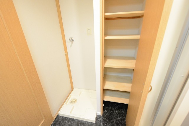 左側にランドリースペースがあり、上部には引き出し可能な吊戸棚が設置されています。
