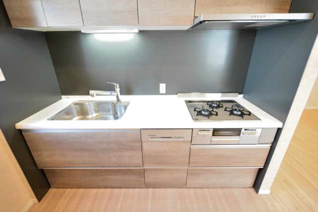 キッチン設備は3口ガスコンロにグリル、浄水器一体に食洗器も付いて充実しています。