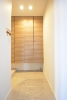 【玄関:大きな姿見・収納力のあるトールタイプのシューズボックス】