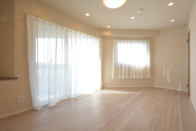 LDKの窓は曇りガラスになっているので、カーテンを開けても目線が気にならずお部屋が明るいです。