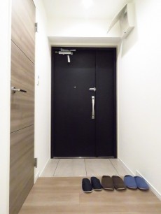 人感センサー付きの玄関ホール。人の気配で自動で照明が消灯するので消し忘れがなく経済的です。インターホンは来訪者の顔が確認できるTVモニターがついています。玄関扉を開ける前はこちらでご確認をどうぞ。