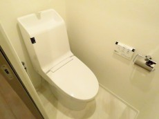 トイレはウォシュレット付き。上にはペーパーのストックの置き場に便利な棚が設置されています。