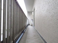 共用廊下はこんな感じの内廊下タイプになっています。玄関前で雨や風の影響をうける心配がないのがうれしいですね。