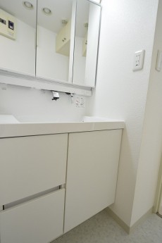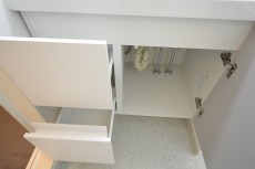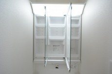洗面台は三面鏡の裏に収納スペースがあるので、歯ブラシやコップなど洗面まわりのゴチャゴチャしがちなアイテムもスッキリお仕舞いただけます。