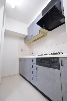 つづいてキッチンスペース。独立タイプなのでお客様が来た時などでも、作業スペースが見えずらいのがいいですね。システムキッチンの隣りに、冷蔵庫のおけるスペースが用意されています。