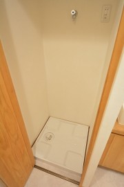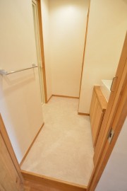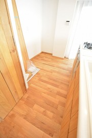 つづいて洗面室です。入口入って右手前に洗面台、右奥に洗濯機置場、
