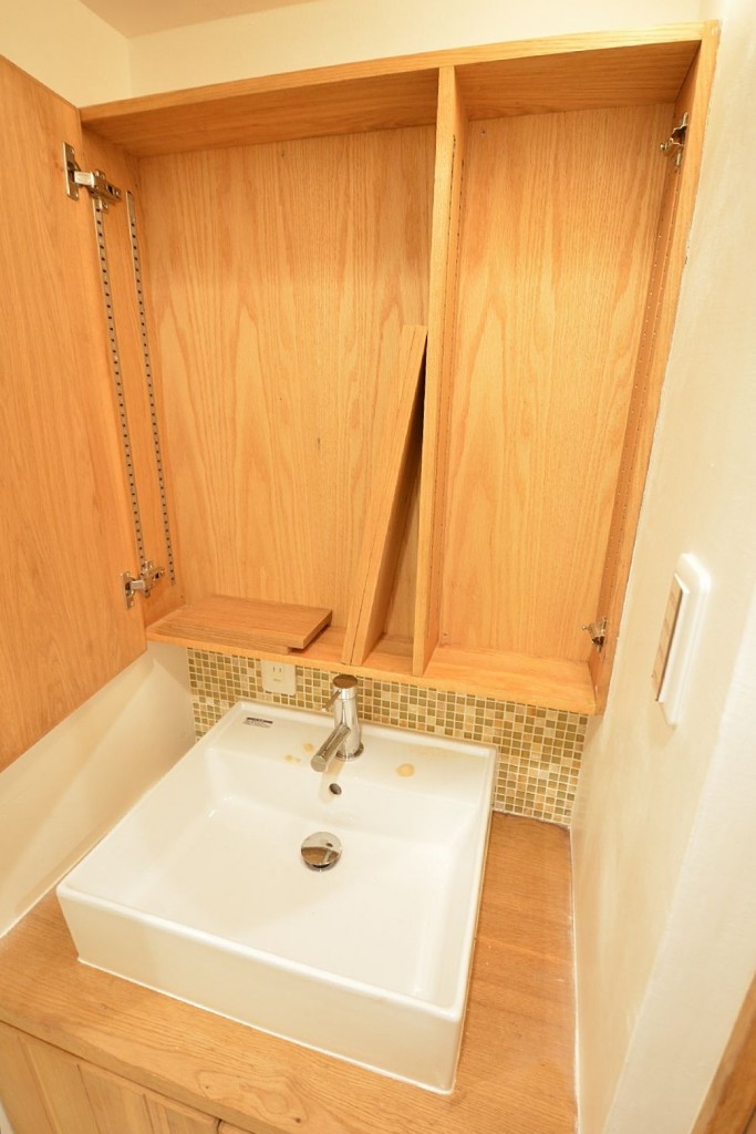 洗面台は鏡の後ろが収納になっています。(まだこれから手が加わるようです。)