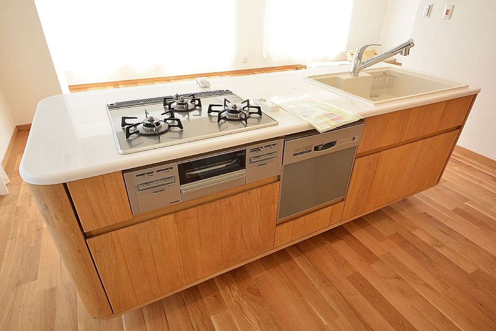 見た目もオシャレですが、食器洗い乾燥機に蛇口一体型浄水器、3口コンロと