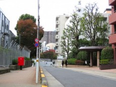 前面道路。人通りもグっと減って落ち着いた雰囲気です。ちなみにお隣は34階建ての青山パークタワーが建っています。