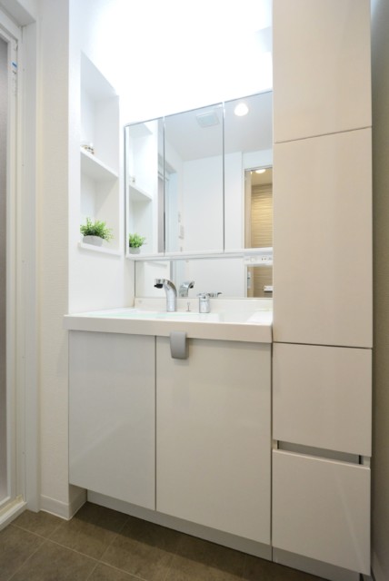 白一色で清潔感のある洗面台は三面鏡付き。照明付きで鏡を使う時に影になったりもしません。