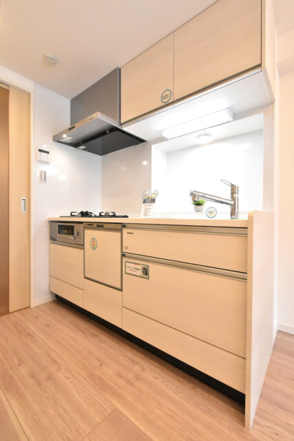 調理台はお部屋の雰囲気に合わせた木目パネル。鏡面仕上げで高級感もあります。