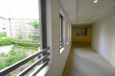 カーペット敷きの共用廊下からも中庭の緑を望みます。