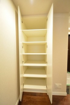 左右に分かれた廊下の右側へ。可動棚の収納スペースもあり、日用品の収納などに重宝します。