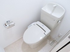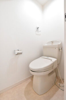 トイレは洗浄便座付き。吊戸棚などはありませんので、突っ張り棚などを後付けしましょう。トイレットペーパーくらいはトイレ内にストックしたいですよね。