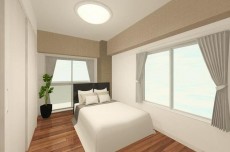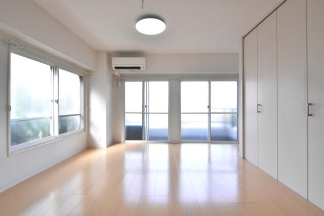 大きな窓が二面にあってとても明るいですね。中間調のフローリングと白のクロス。シンプルで、家具やカーテンなどのインテリアによって自分好みの雰囲気に変えていけるお部屋です。