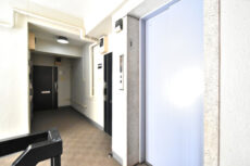 エレベーターで3階まで上がります。横には階段もありますので、運動不足解消のためにたまには利用するのも良さそうですね。お部屋は雨風の入らない内廊下風部分と、明るい外廊下部分に分かれて並んでいました。