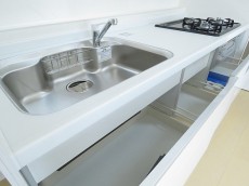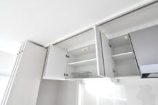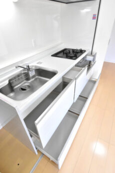 収納は調理台下のスライドキャビネットと吊戸棚。引き出しタイプのスライドキャビネットは大きな鍋などでも楽に出し入れが可能です。びっしり詰めても中が確認しやすいのも嬉しいですよね。逆に吊戸棚にはあまり使わない物を入れるのが良さそうです。私のイメージではカセットコンロや土鍋、蒸籠などでしょうか(^-^;
