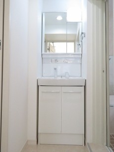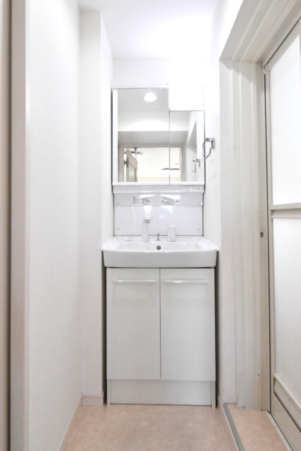 清潔感のある白い洗面化粧台。鏡の裏や洗面ボウル下の収納スペースに小物やシャンプーのストックなどを入れておくイメージでしょうか。
