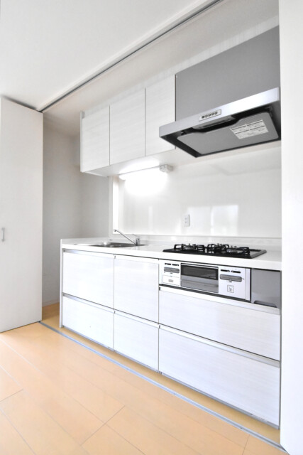 白を基調としたシステムキッチンは、扉を開けた時でもお部屋との一体感があります。やっぱり白は清潔感があっていいですよね。