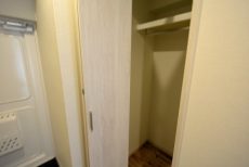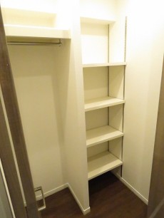 システム収納の向かい側には縦長のスリムな物入れもありました。掃除道具や日用品のストックなどはこの中に入れておくイメージでしょうか。棚は可動棚です。