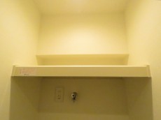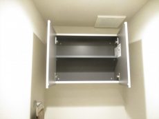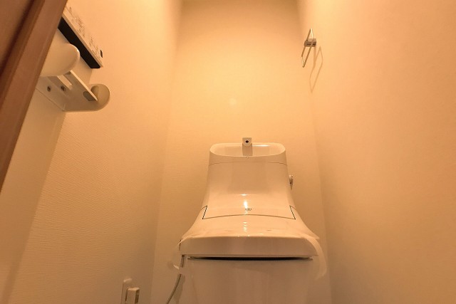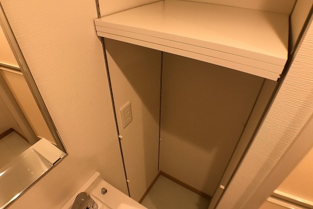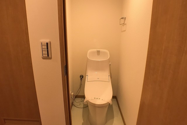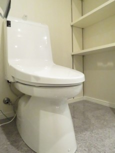 トイレはウォシュレット付き。横に可動棚が設置されています。