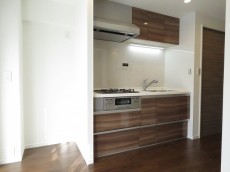 キッチンはフローリングに馴染む木目柄。すぐ横が窓なのでお料理中の熱や匂いも解消しやすいハズ!水栓は浄水機能付き、コンロは3口ガスコンロです。