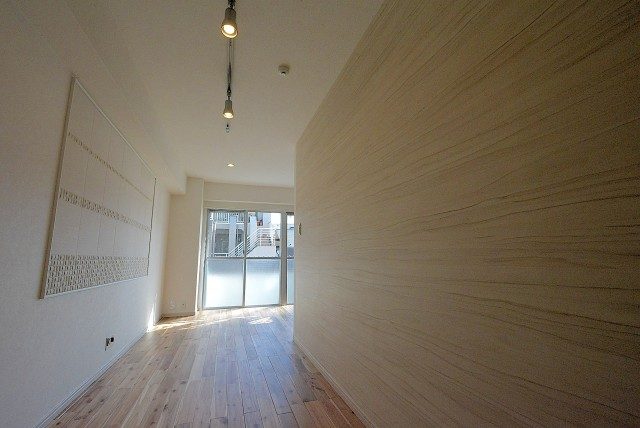 壁面の一部には淡い色合いのカラークロスが使われ、ブラケット照明が設置されています。さりげなくオシャレです。