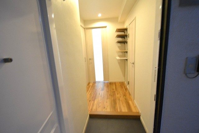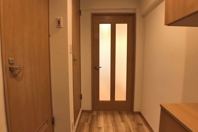 玄関をあがると目の前は廊下。廊下側には水回りの設備があります。