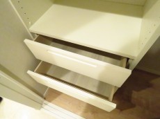 大きな収納はここ1か所になるのでなるべくたくさん仕舞いたいところ。整理しやすいように棚や引き出しがついているのがうれしいですね。