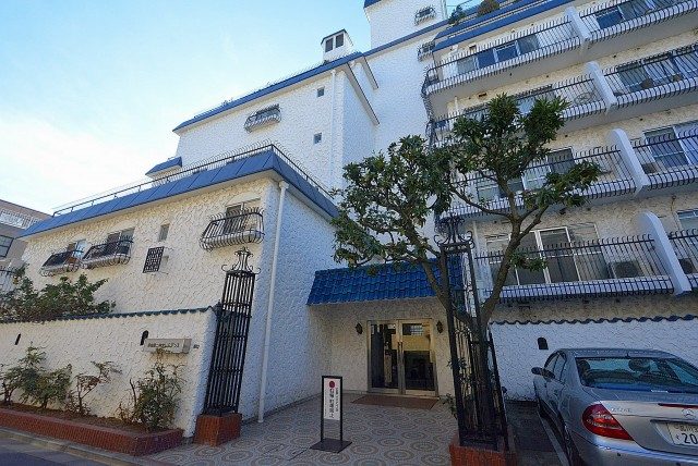 白い外観に青い屋根の秀和シリーズのマンションです。