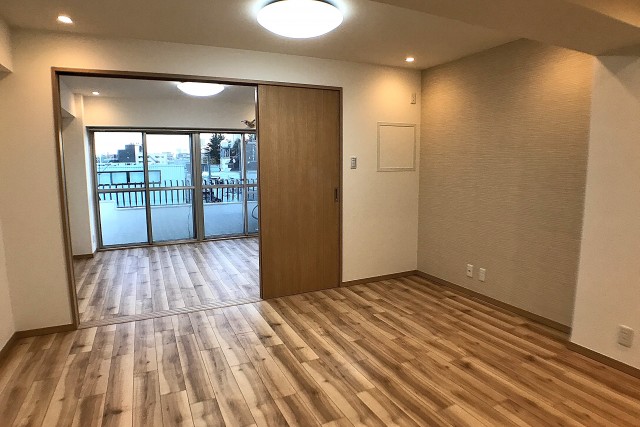 リビングは約12.3帖。スライド式で洋室と繋がっております。