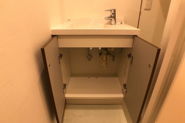 洗面化粧台は引き出し、横のキャビネットと収納スペースもしっかりあります。