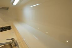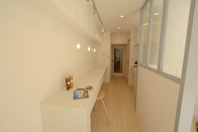 扉を開くと白いタイルのカウンターが続くカフェのようなお洒落な空間が広がっています。