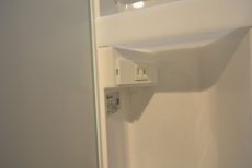 鏡裏に三段の収納付きです♪コンセントは鏡裏にもあり、全部で2つあります✿
