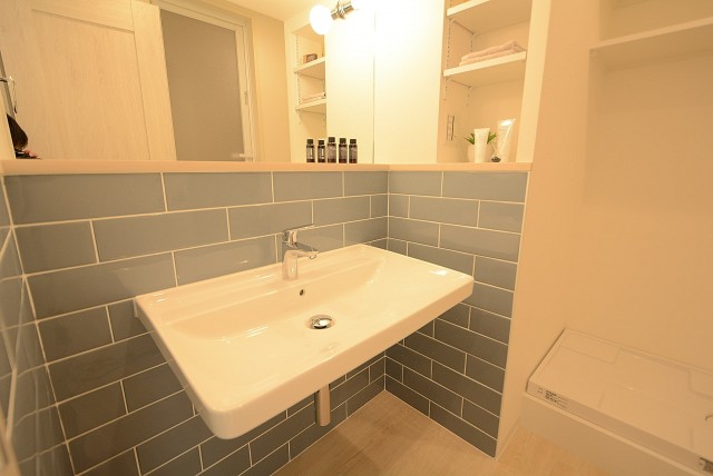 ブルーグレイのタイルがスタイリッシュなパウダールーム。