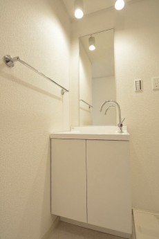 洗面室は入口入ってすぐ左手前がトイレ、左奥が洗面台と洗濯機置場、