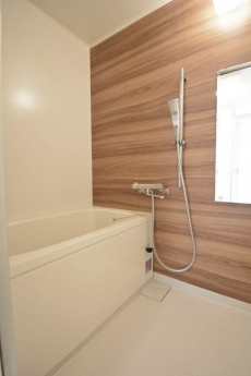 木目調のパネルと白いバスタブでナチュラルな雰囲気のバスルーム。
