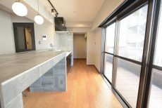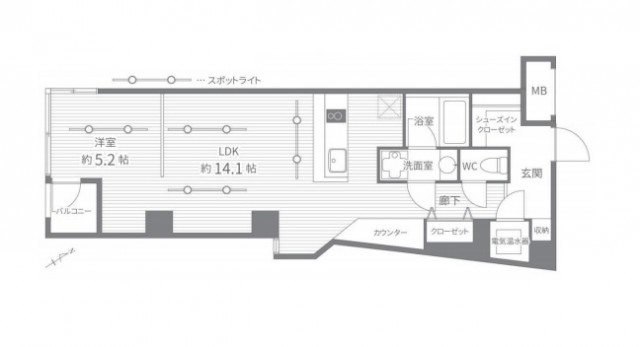 洋室と言いましても、リビングダイニングキッチンとは、上部が開いているついたての様な壁で仕切られていますので、ほぼ一つのお部屋です。全体としてワンルームのお部屋と考えていただいた方が良いと思います。