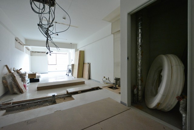 お~っ、思ったより何もありませんね!ほぼ空っぽの状態です。交換前の配管なども置いてあって、リノベーション予定に並んでいた『新規交換』が本当だって分かりますね。