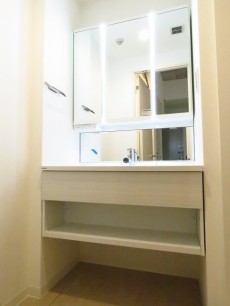 洗面化粧台は鏡の裏が一面収納になっており、ゴチャゴチャしがちな小物類もすっきりお仕舞いただけます。洗面ボウルとカウンターは一体型なので濡れた物を置いても気にならずお掃除も楽ラク。