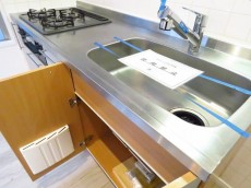 キッチンは水栓に浄水機能付き、コンロは3口ガスコンロ。