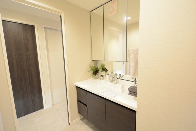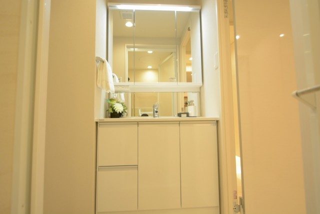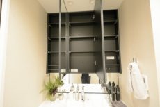 洗面化粧台は3面鏡タイプです。鏡を開けると収納棚になっており、歯ブラシや化粧品などの小物類を収納できます。